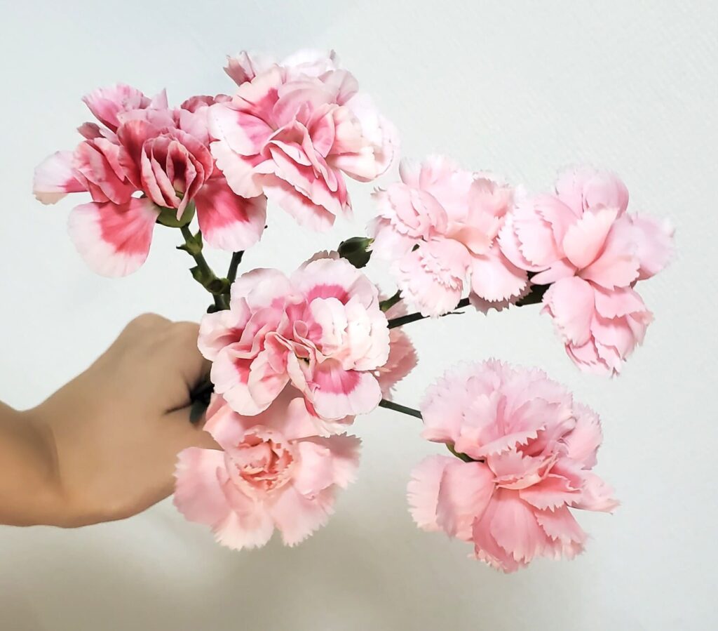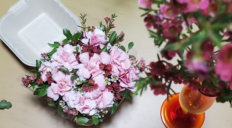 まず、今回使用したお花を紹介します。本当は12月に入るため、赤や緑を中心としたクリスマスらしいアレンジメントを計画していたのですが、残念ながらお花屋さんに良いサイズ感の赤や緑の花がなかったため、最初に目にとまったピンク色のカーネーションを中心に選びました。