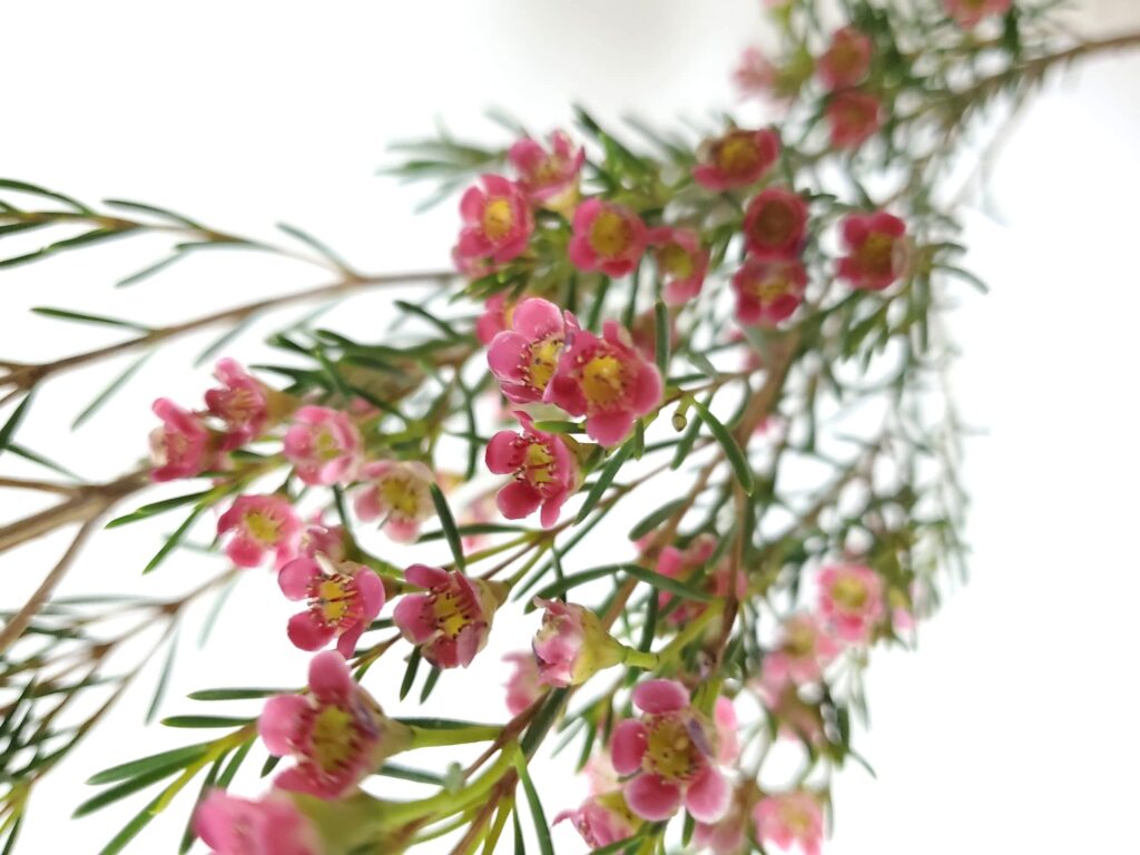 次にワックスフラワーを挿しました。白い花がついている枝を多めに使いたかったのですが、残念ながらお店にこの1本しか在庫がありませんでした。
