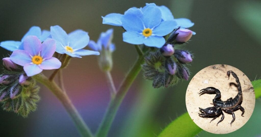 学名である「Myosotis(ミオソティス)」は、ギリシア語で「ハツカネズミ(myos)」と「耳(otis)」を組み合わせた言葉です。勿忘草の葉が柔らかい毛でおおわれていることにちなんでいます。勿忘草は、茎の先端がサソリの尻尾のようにくるりと巻き、花を咲かせます。これは、ムラサキ科植物などに見られる特徴で、サソリ型花序と呼ばれます。この花が咲く様子がサソリの尾のように曲がっている様子から種小名は「サソリ(scorpioides)」と名付けられています。