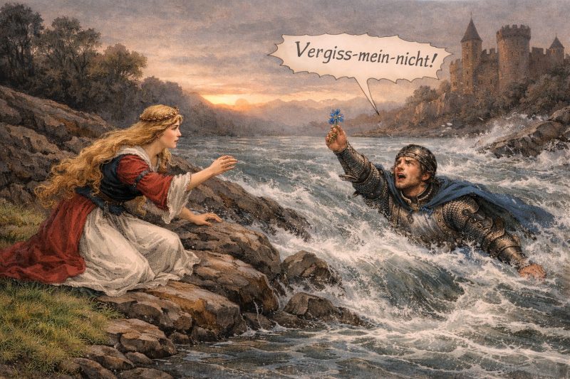 英名の「Forget-me-not」は、中世ドイツに伝わる騎士ルドルフと恋人ベルタの悲恋の伝説に由来しています。ルドルフは、恋人ベルタのために、花を摘もうちしたところ、ドナウ川の急流に飲まれてしまいました。ルドルフは、岸辺のベルタへ花を投げながら「私を忘れないで(Vergiss-mein-nicht!)」と叫びました。ルドルフが残した最後の言葉「私を忘れないで(Vergiss-mein-nicht!)」が、そのまま世界共通の名前となりました。